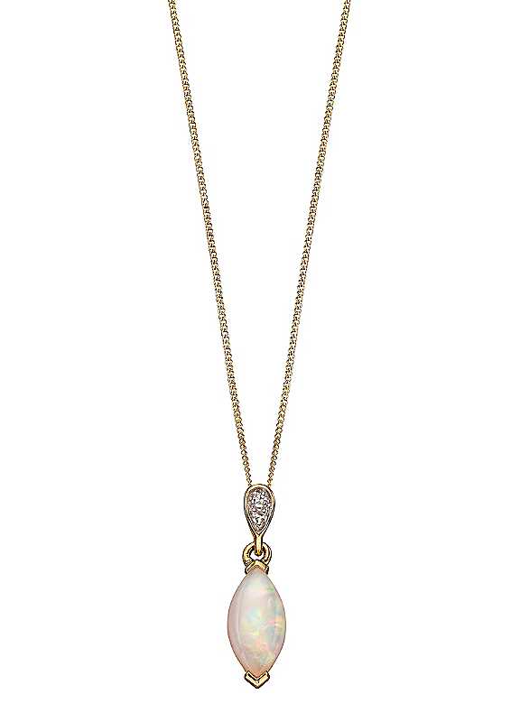 The timeless marquise style gets an update in this stunning 9ct gold necklace. Featuring a beautiful opal stone as well as 2 dazzling diamonds, this piece is full of sparkle. Brand: Elements Gold Material: 9ct gold Qty & Name of Stones: 1 opal & 2 diamonds Clasp: Bolt ring Height Inc. bale 17.5 mm Width: 5 mm Depth: 3 mm Chain length approx. 46 cm (18 in) | delicate gold necklace, gold opal necklace, gold diamond necklace, opal and diamond necklace, delicate diamond necklace, october birthstone necklace, marquise pendant necklace, gold pendant necklace