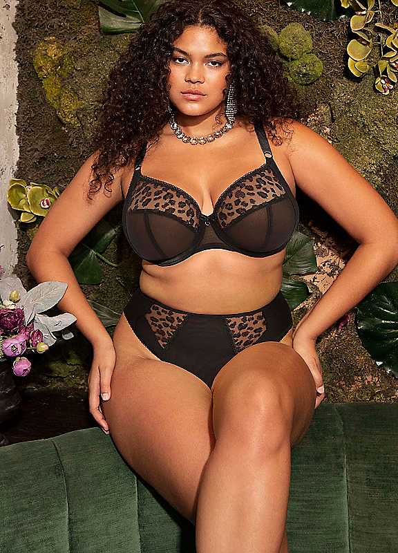 Namrah High Leg Brief features a leopard spot design embroidery detail at the front. Front and back are cut from double layered stretch mesh for a light look with modesty. Pair with the matching bra. Brand: Elomi Leopard spot design Machine washable 89% Nylon/Polyamide, 6% Elastane, 5% Polyester | plus size ladies briefs, high cut briefs, nylon women's briefs, leopard print briefs, black briefs for women