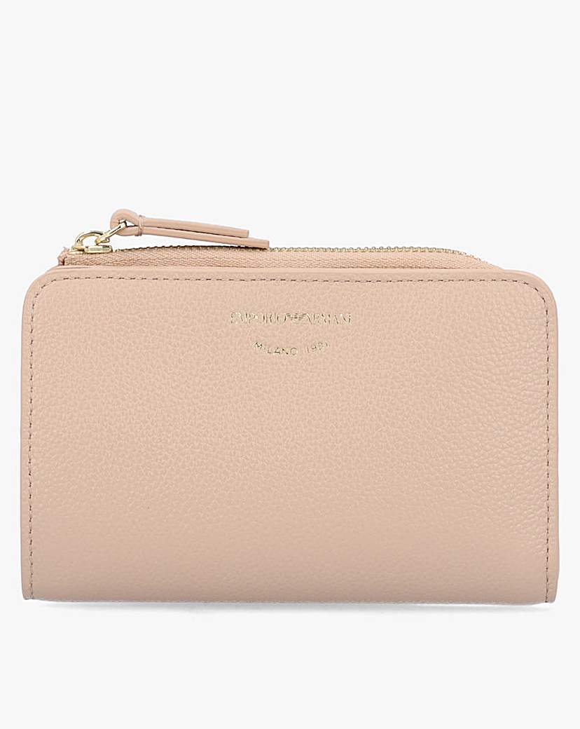 Emporio Armani Bifold Nude Tumbled Leather Zip Around Wallet The Emporio Armani Bifold Nude Tumbled Leather Zip Around Wallet is part of the New Season collection. An everyday accessory crafted from a premium grained leather with polished gold tone accents. Secure popper fastener allows access to multiple card slots as well as notes compartment, zip around coin pouch also features. Heritage silkscreen branded logo adds detail to the front of the wallet. Signature Emporio Armani branding completes the design. Technical information: Tumbled Leather, Gold Tone Hardware, Popper Fastening, Zip Around Coin Pouch, Multiple Card Slots, Notes Compartment, Silkscreen Logo, Emporio Armani Branding, Comes In Gift Box Dimensions: L13 x H8.5 x 3 CM
