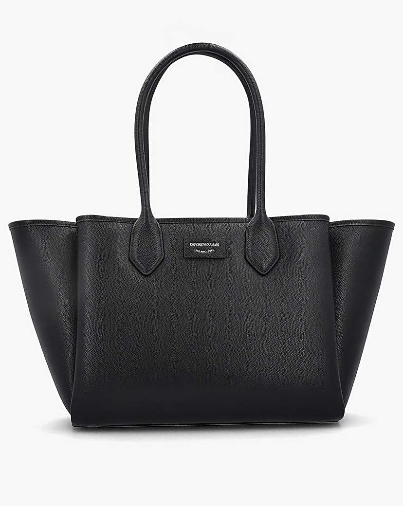 Emporio Armani Grana Black Leather Winged Shopper Bag Add the Emporio Armani Grana Black Leather Winged Shopper Bag to your handbag collection. This New Season style combines style and functionality. Crafted from a premium PU material in a palmellato design with silver tone accents. Spacious triple compartments featuring zip and magnetic snap fastening. Carry by the top handles. Iconic screen-printed logo adds detail to the front of the bag. Signature Emporio Armani branding completes the design. Technical information: Palmellato Finish PU, Silver Tone Hardware, Triple Compartments, Central Magnetic Snap Fastening, Zipper Fastening Pockets, Top Handles, Silkscreen Logo, Emporio Armani Branding, Includes Dust Bag Dimensions: L32 x H24 x D17 CM
