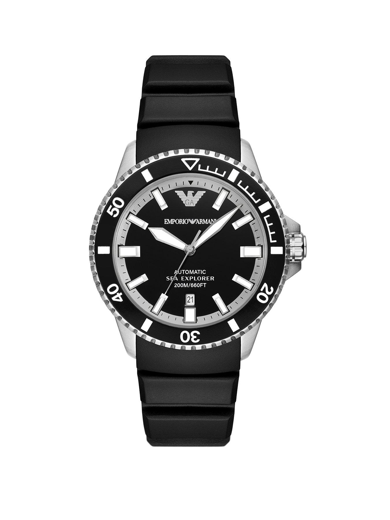 The Emporio Armani Sea Explorer Elite Automatic Black Silicone Watch Is Built For Men Who Crave Adventure. The Emporio Armani 42.5Mm Watch Is A Bold And Rugged Timepiece That Combines Style With Functionality. Its Glossy Black Enamel Dial And Matching Green Aluminum Bezel Insert Create A Striking, Timeless Look That Stands Out In Any Setting - Day Or Night. The Super-Luminova Detailing On The Hands, Indexes, And Bezel Markings Ensures Excellent Visibility, Even In Low-Light Conditions, Making It As Practical As It Is Stylish. Built For Durability, This Watch Features A Sapphire Crystal For Scratch Resistance And A Robust Stainless Steel Bracelet That Adds A Touch Of Sophistication. The Automatic Movement Ensures Precision And Reliability, While The Screwed Crown And 20 Atm Water Resistance Make It Suitable For Recreational Diving And Water Sports. Whether You'Re Exploring The Great Outdoors Or Attending A Formal Event, This Watch Is Designed To Turn Heads With Its Perfect Blend Of Performance And Power. Depth: 14 Mm Height: 200 Mm Width: 42 Mm 42.5Mm Case, 22Mm Band Width, Sapphire Crystal, Automatic Movement With Automatic Analog Display, Imported. Round Stainless Steel Case, With A Black Dial. Black, Silicone Band. Water Resistant Up To 200M: In General, Suitable For Professional Marine Activity And Serious Surface Water Sports, But Not Diving.