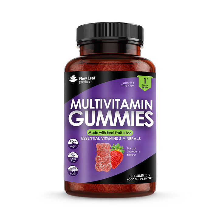 Essential Multivitamins Minerals Gummies All-round complete bodily support Helps with Fatigue Tiredness Provides Immune System regulation HIGH STRENGTH VITAMINS - 14 Essential Vitamins And Minerals - Our multivitamin supplement for adults is filled with a nutritious blend of Vitamin C, Vitamin B12, Vitamin A, Vitamin D3, Vitamin E, Folic acid, Biotin, Zinc, Iodine, Sodium, Choline, and Inositol. Vitamin C contributes to normal collagen formation for the normal function of bones, gums, skin, and teeth. Vitamin C and Vitamin E contribute to the protection of cells from oxidative stress ESSENTIAL VITAMINS MINERALS - Vitamin A, and Vitamin D contribute to the normal function of the immune system. Biotin contributes to the maintenance of normal skin and hair and Vitamin C contributes to the reduction of tiredness and fatigue. Vitamin D contributes to the maintenance of normal bones, teeth, and muscle function New Leaf Products LTD - 74 Brent Street - London - NW4 2ES - United Kingdom