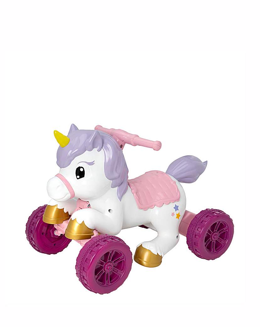 Let your child's imagination soar with EVO's Unicorn Ride-on! This enchanted battery-powered ride-on brings the magic of unicorns to life, offering hours of imaginative play and the chance to embark on an exciting unicorn adventure! Making the journey even more exciting with sound effects and a light up horn, watch your child immerse into a world of fantasy and fun. The 4 wheels allow a sturdy and thrilling ride. The Unicorn Ride On is equipped with a one-speed forward drive motor with an easy to use button on the handlebar to activate the acceleration reaching speeds of 3kmph with a run time of 40 minutes. Features a 6V rechargeable battery for when your child is gearing up for their next wild adventure. Maximum weight of 25kg. Ages from 2 years.