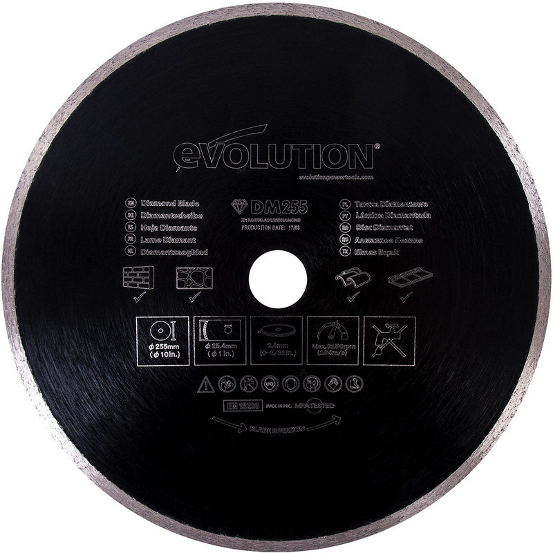 * 255mm blade diameter and 25.4mm bore diameter * High concentration of diamond for longevity * Ideal for cutting brick, concrete and stone * Hardened blade body ensures the blade runs truer for longer * Compatible with the R255SMS & R255SMS-DB Mitre Saws * Ideal for cutting brick, concrete, stone, glazed tiles and porcelain The 255mm diamond blade greatly enhances Evolution multipurpose saw's versatility. It allows the machine to cut stone, concrete, paving slabs and marble. A durable blade which features a high concentration of diamond for longevity and a hot-pressed turbo segmented rim for consistent cutting ability. | Evolution Diamond Blade 255mm