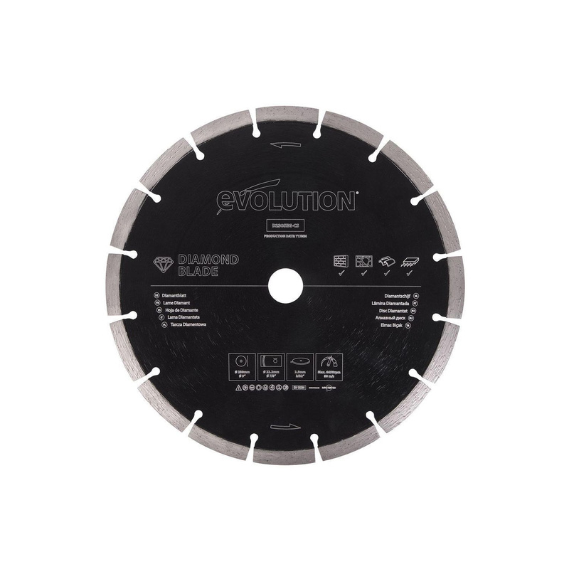 * Compatible with the R230DCT Concrete Cutting Saw * Quality diamond edge delivers heavy-duty performance. * Easily cuts with outstanding performance on both hard and abrasive masonry, hard brick, pavers, stone, concrete, and steel re-enforced concrete. * Popular choice among contractors * 230mm Segmented Edge and 22.2mm Bore High performance diamond blade with the ability to cut all types of masonry including reinforced concrete with steel rebar. | Evolution General Purpose Diamond Blade 230mm