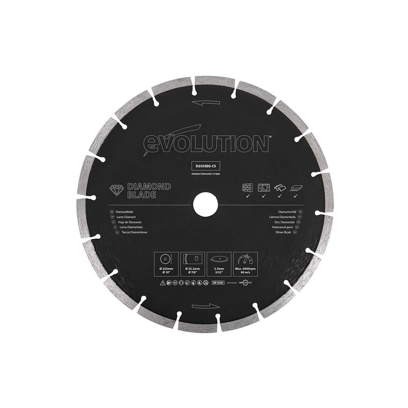 * Compatible with the R255DCT Concrete Cutting Saw * Quality diamond edge delivers heavy-duty performance. * Easily cuts with outstanding performance on both hard and abrasive masonry, hard brick, pavers, stone, concrete, and steel re-enforced concrete. * Popular choice among contractors * 255mm Segmented Edge and 22.2mm Bore High performance, cost effective diamond coated masonry saw blade with the ability to cut all types of masonry including reinforced concrete with steel rebar. | Evolution General Purpose Diamond Blade 255mm