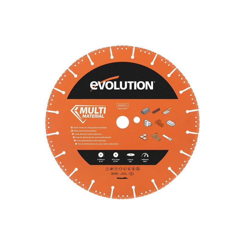 * Compatible with the R300DCT and R300DCT+ Concrete Cutting Saw * Up to 30x longer blade life than abrasive discs when cutting metal. Diamond cutting edge is incredibly tough and can make over 1,000 cuts through steel. * Cuts most common building materials including ferrous & non-ferrous metals, bricks, tiles, plastics & more * Thick body plate strengthens the blade for stability and accuracy * 300mm Segmented Edge and 22.2mm Bore The Evolution Heavy-Duty Demolition Disc Cutter Blade is the ultimate Multi-material saw blade. It's packed with coarse grain diamond cutting power to help you slice through masonry, rebar reinforced slab, mild steel, and non-ferrous metals. Indoors or outdoors the Heavy-Duty Demolition blade will tackle any construction cutting task. Whether you're putting buildings up or knocking them down you need a powerful saw that you can rely on, with a blade that outlasts the competition to make quick and easy cuts. Saturated with coarse grain industrial diamonds, the cutting edge on the Heavy-Duty Demolition Disc Cutter Blade will tackle any cutting task. It's built for long life, harsh working conditions and the toughest cuts. * Constant Diameter: Steel blade body with diamond cutting edge maintains its full diameter so you have maximum cutting capacity for the lifetime of the blade. * Cleaner & Safer: The steel body won't shatter, unlike abrasives, which can cause serious injury. Less dust, less sparks & less odour vs abrasive discs, make this a safer cutting solution. * Cooling holes close to the edge expel heat to maintain optimum cutting performance. * Heavily concentrated diamonds give a coarser cutting edge compared to standard diamond blades. * Superior quality diamonds for longer blade life. * Segmented rim design with sub-segmented cutting edge improves efficiency & removes debris from the cut. * Thick body plate strengthens the blade for stability and accuracy. | Evolution Multi-Material Diamond Blade 300mm