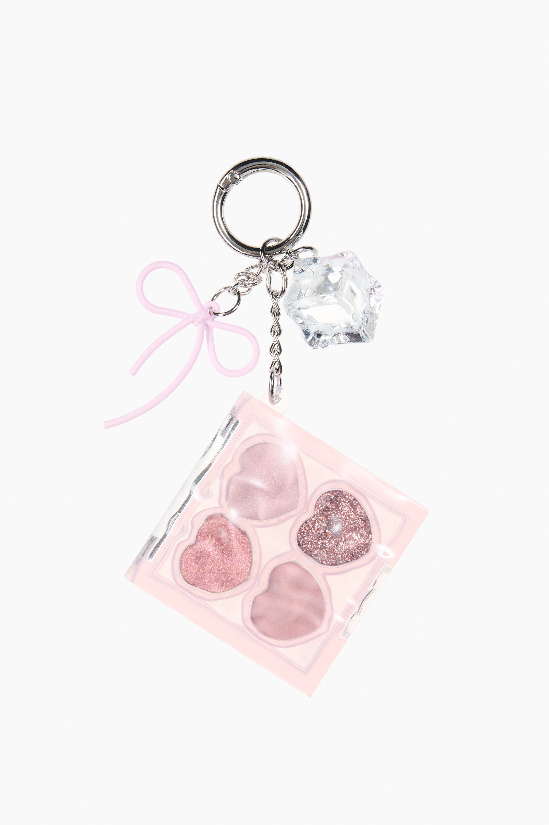 A cute and compact eyeshadow palette with a keyring attachment – perfect for clipping onto your bag or keys for easy, on-the-go touch-ups. It features four buildable, fragrance-free shades: sparkling pink gold, light shimmery pink, matte nude beige and glittery rose gold. The keyring is adorned with a transparent ice cube-shaped charm and a pink metal bow, adding a playful and stylish touch. Vegan. 2 g.