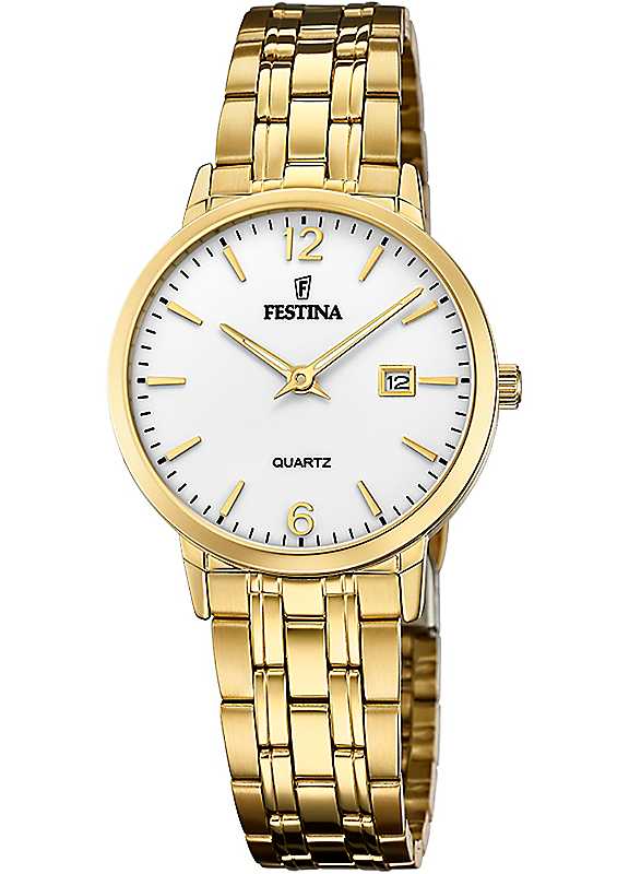 Elegant and classic gold-plated Stainless Steel watch with Date indication. The watch is 5 bar water resistant and comes with a nice steel bracelet.Brand: FestinaPlated Stainless Steel round caseWater resistance to 50 meters2 Years manufacturer warrantyStainless Steel bracelet with push button deployment claspProtective hardened mineral glassMetal