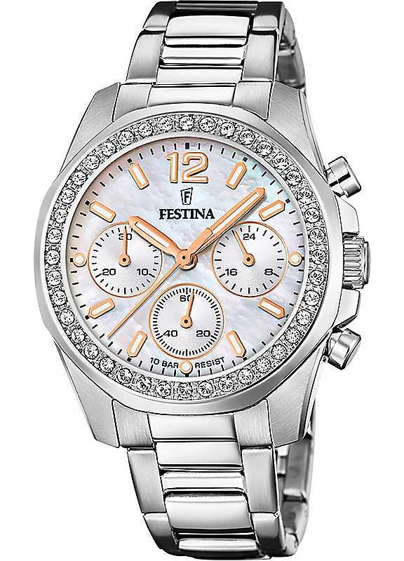 Elegant and sporty Stainless Steel Chronograph watch with Mother-of-Pearl dial and zirconia set into bezel. The watch is 10 bar water resistant and comes with a nice steel bracelet.Brand: FestinaStainless Steel round caseWater resistance to 100 meters2 Years manufacturer warrantyStainless Steel bracelet with push button deployment claspProtective hardened mineral glassChronograph functionsMetal