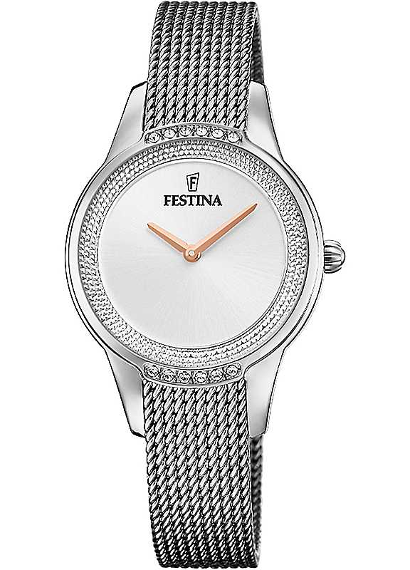 Cool and trendy ladies Stainless Steel watch with 5 bar water resistance and a Stainless Steel Mesh Bracelet. Sparkling Crystals are set into dial and bezel.Brand: FestinaStainless Steel round caseWater resistance to 50 meters2 Years manufacturer warrantyStainless Steel mesh bracelet with sliding claspProtective hardened mineral glassMetal | milanese bracelet, female analog watches, casual watch ladies, round watches ladies, steel watch ladies, water resistant watch, ladies crystal watch, silver wrist watch