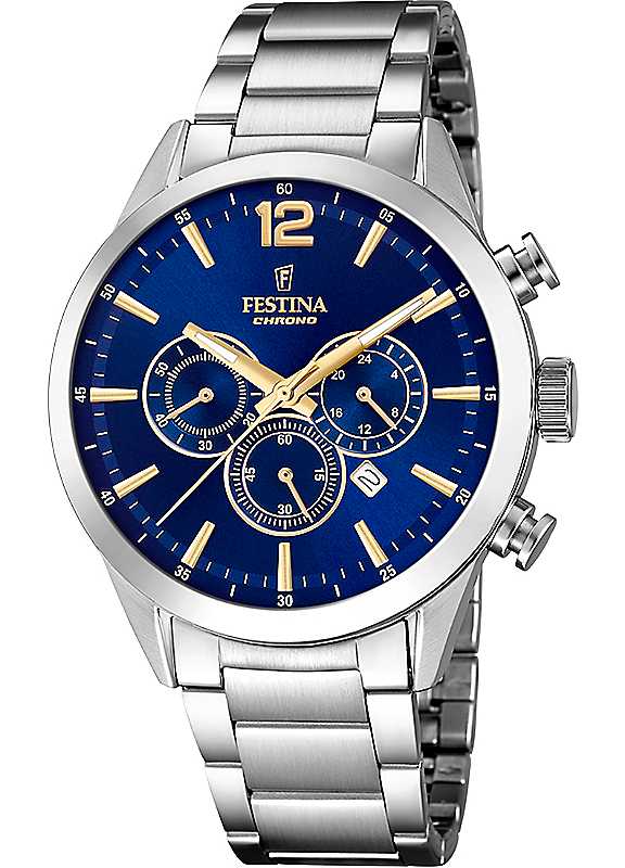 Sporty and elegant Stainless Steel Chronograph watch with date indication. The watch is 5 bar water resistant and comes with a Stainless Steel bracelet.Brand: FestinaStainless Steel round caseWater resistance to 50 meters2 Years manufacturer warrantyStainless Steel bracelet with push button deployment claspProtective hardened mineral glassChronograph functionsMetal | steel watch bracelet, round watches men, silver blue watch, mens stainless watch, mens chronograph watch, water resistant watch