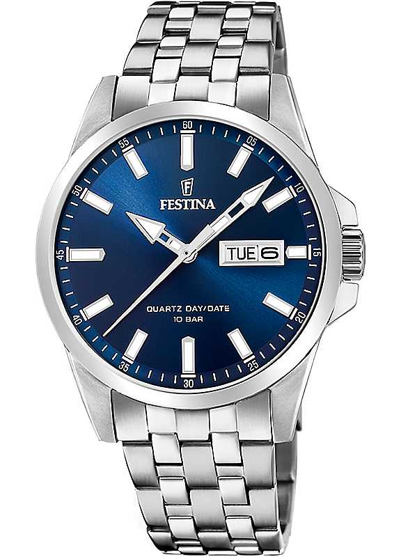 Casual and classic Stainless Steel watch with day-date indication, 10 bar water resistance and a Stainless Steel BraceletBrand: FestinaStainless Steel round caseWater resistance to 100 meters2 Years manufacturer warrantyStainless Steel bracelet with push button deployment claspProtective hardened mineral glassMetal | analog day date, quartz watches men, stainless steel watch, round watches men, mineral glass watch, water resistant watch, steel watch bracelet, mens watch bracelet, classic watches men, silver blue watch