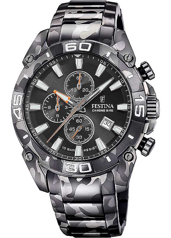 Sporty precision and uncompromising black camouflage pattern IP-plated stainless steel chronograph watch with date function, 10 bar water resistance and a solid steel bracelet. Inspired by cycling features and a clear structured dial. The watch comes in a box-set with an additional rubber strap.Date & 20 ATMChronograph stopwatchStainless Steel | round dial watches, metal strap watch, steel watch bracelet, round watches, stainless steel analog watch, stainless watch bracelet, stainless strap watch, black analog watch, watch stainless steel black, black metal strap, steel strap watch, black steel strap