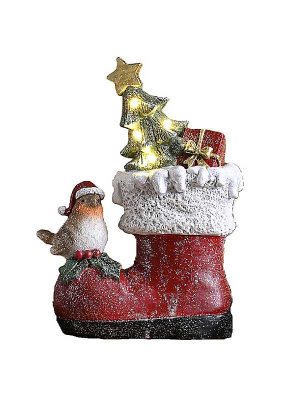 Add a heartwarming touch to your festive decor with this 29cm battery-operated polyresin decoration featuring a cheerful robin perched on Santa's boot, surrounded by a Christmas tree and festive parcels. With gentle built - in lighting to bring the scene to life, this charming tabletop piece is perfect for mantels, side tables, or as a seasonal gift. Crafted from detailed polyresin and lit for a cozy glow.Battery operatedRequires 2 x AAA batteries (not included)Dimensions: 30 x 11 x 22 cm