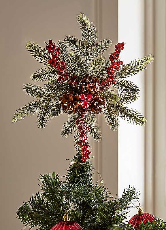 Complete your Christmas tree with this elegant 33cm red berry and pine tree topper. Featuring clusters of vibrant red berries nestled among realistic pine branches, this topper adds a natural yet festive finish to your festive centrepiece. Lightweight and easy to position, it blends beautifully with traditional or rustic themes.Tree topper Dimensions: 34 x 7 x 22 cm | traditional christmas decor, rustic tree topper, star tree topper, red christmas decor, rustic christmas decor