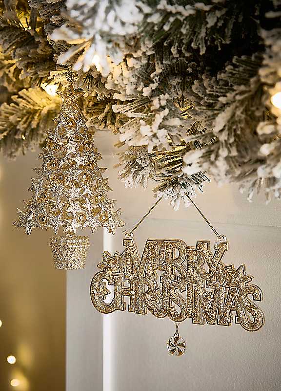 Add a festive sparkle to your Christmas display with this charming duo of hanging decorations. 1 x 16cm gold glitter tree, made up of stars and beads to create the shape of a tree. 1 x 15cm clear gold and gold glitter MERRY CHRISTMAS sign adorn with stars and a hanging round acrylic candy shape. Set of 2 - one of each design Dimensions (Tree): 10 x 3.5 x 16.5 cm Dimensions (Merry Xmas): 15.4 x 10 cm