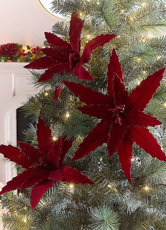 Elevate your festive floral displays with this set of three 40cm burgundy poinsettia stems. Each stem showcases a richly coloured bloom with intricately shaped jagged edges, offering a bold and contemporary twist on a classic Christmas favourite. The deep burgundy hue adds warmth and sophistication, perfect for enhancing wreaths, garlands, vases, or festive table arrangementsSet of 3 Dimensions: 40 x 34 x 34 cm | artificial poinsettia stems, christmas decorations indoor, burgundy flower stems