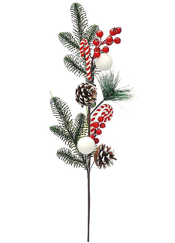 Bring festive flair to your festive arrangements with this set of three 73cm Christmas spray, designed with a joyful mix of green foliage, red berries, white baubles, frosted pinecones, and playful candy swirl accents. Perfect for adding height and colour to vases, floral displays, or wreaths, this spray combines traditional charm with a whimsical twist for eye-catching seasonal decor.Set of 3 Dimensions: 73 cm