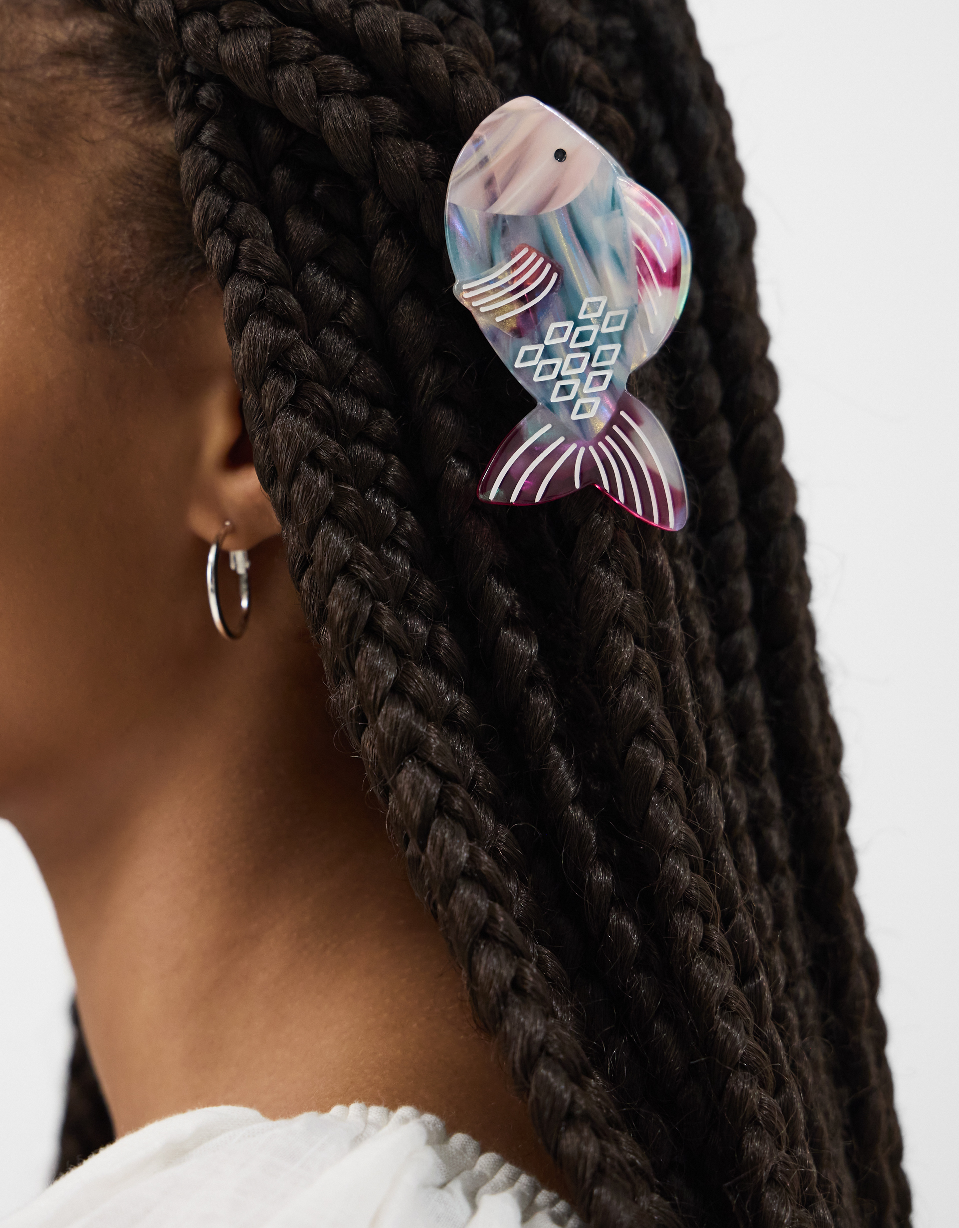 Crafted with iridescent resin, this claw clip is shaped like a fish, and designed with detailed scales and fins. A reel catch, don't you think?