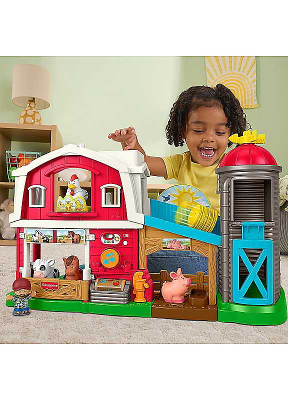 Toddlers can harvest endless hours of imaginative storytelling play with the Little People Caring Fun Animal Farm playset from Fisher-Price. This interactive playset features a two-story barn packed with hands-on activities all around, plus a drop-through silo and multiple stalls to house and care for the animals. As kids play out fun days on the farm, Smart Stages technology introduces opposites, colours, counting and more with 50+ sing-along songs, sounds and phrases. Includes 1 farmer figure, 4 animals, and 1 hay bale play piece. Use the globe button to select a language: English, French, German, Italian, or Dutch. Requires 2 AA batteries (included). Colours and decorations may vary.Age suitability: 1 years+