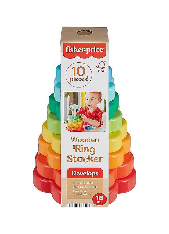 The Wooden Ring Stacker from Fisher-Price is a fresh take on a classic stacking toy. Toddlers will love sorting, stacking and spinning the easy-to-grasp colourful scalloped shaped rings on the wooden stacking base.Made with wood from Forest Stewardship Council-certified sources (FSC-N004566) and decorated with non-toxic, water-based paints, this stacking activity is a fun way to help kids develop fine motor skills as they play. Colours and decorations may vary.Age suitability: 18 Months+