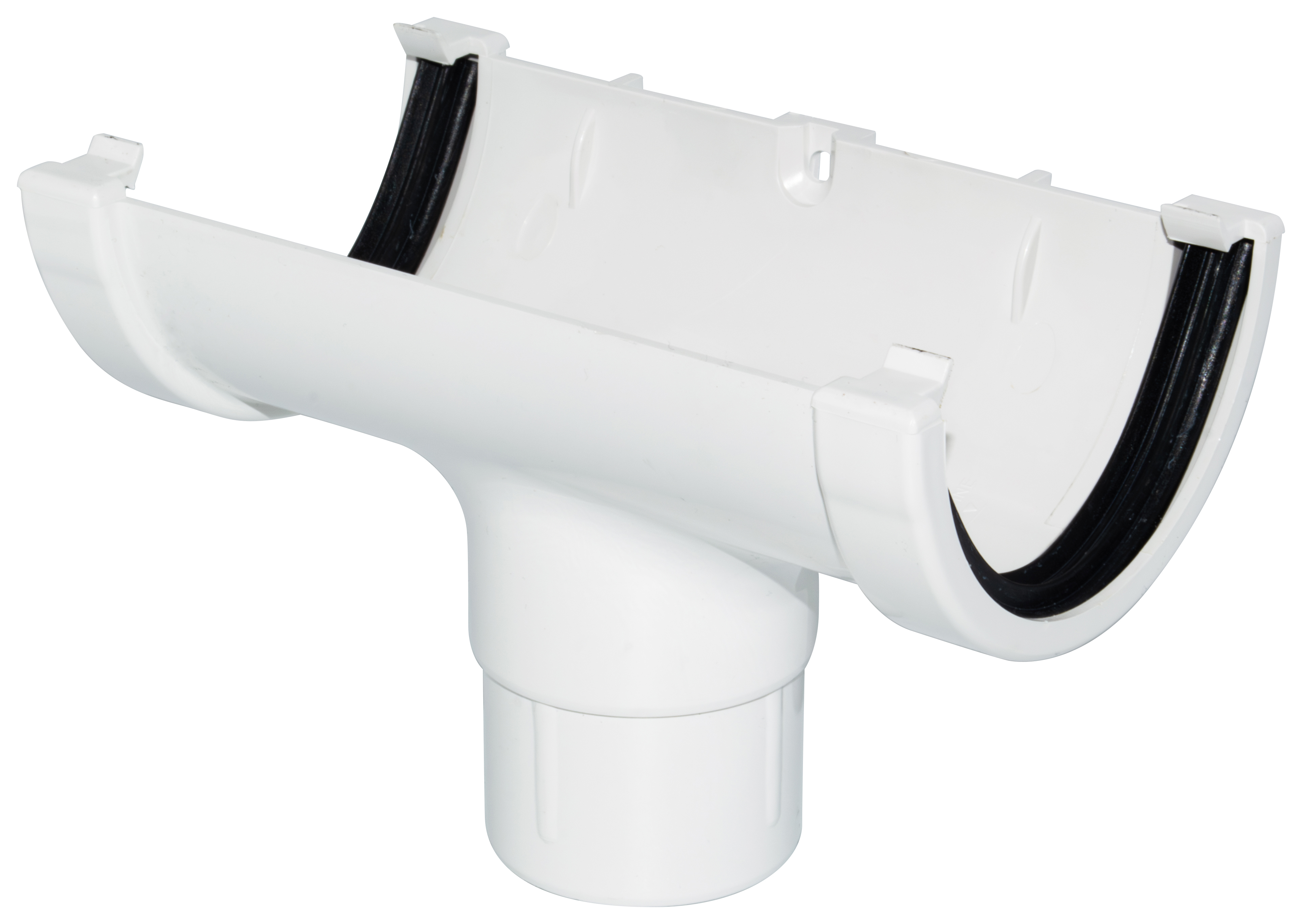FloPlast 76mm White Miniflo Gutter Running Outlet - FloPlast MiniFlo Gutter Running Outlet is used to connect 2 MiniFlo gutter lengths and provides an outlet for a 50mm MiniFlo downpipe from the gutter. A smaller profile based on the original round line system, it is an ideal solution for garages, sheds, summerhouses and most garden buildings.
