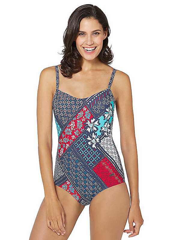 Pretty swimsuit in a colourful floral mixed print, with narrow adjustable straps. Finished with soft cups, underbust band, half corsage and a round-cut back. Adjustable straps Hand wash only 80% Polyamide, 20% Elastane