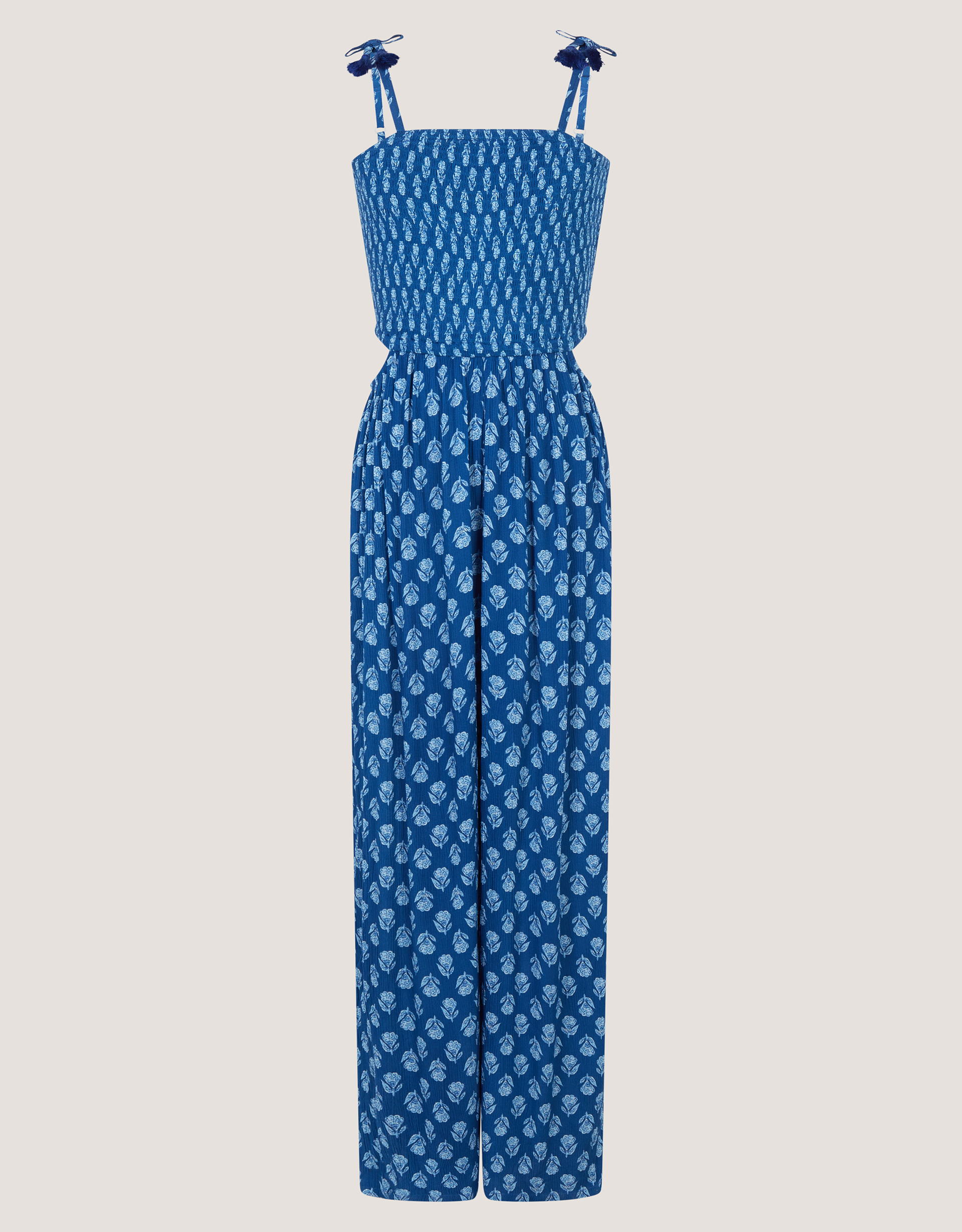Hello, sunshine. When they're bored of wearing sundresses, cue this jumpsuit. Designed in lightweight viscose for a breathable finish, it features a wood block-inspired floral print, stretchy smocked bodice with tassel straps and full length bottoms in a wide leg fit. Peep the cut-out sides at the waistline, too! Blue