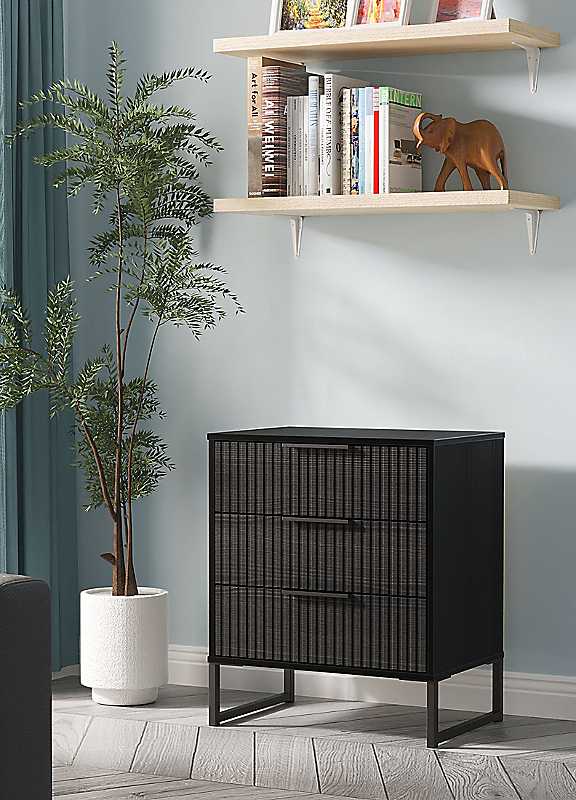 This 3 drawer bedside cabinet is wider than normal for added practicality. Perfect for any bedside or as a free standing storage unit. A new stand out range, with its new deep cut 'fluted' grove patten of the drawer and door fronts. Featuring black metal handles and black sleigh legs. A striking and individual range that is perfect for the modern home. All our furniture is made to order in the United Kingdom, to the highest quality using responsibly sourced materials. Furniture comes fully assembled (although items with legs will have those legs removed during transit to avoid damage). Ready AssembledWeight Capacity: 30kg Specifications Material: MFC & MDF Manufacturer's 1 year guarantee Product Care: Wipe clean onlyMade in the UK Weight of product 28kg Wall Anchor kit included Overall Assembled Dimensions Hx76 Wx58 D40cm Specification Leg Material: Metal