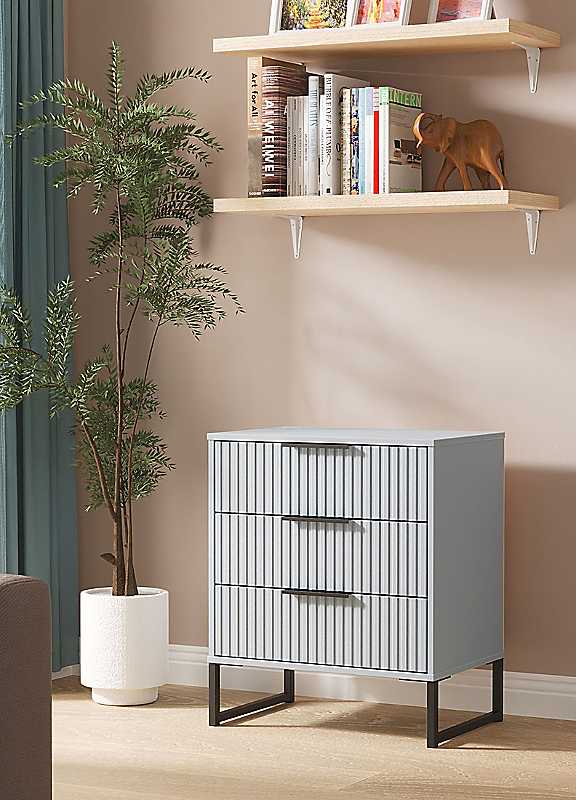 This 3 drawer bedside cabinet is wider than normal for added practicality. Perfect for any bedside or as a free standing storage unit. A new stand out range, with its new deep cut 'fluted' grove patten of the drawer and door fronts. Featuring black metal handles and black sleigh legs. A striking and individual range that is perfect for the modern home. All our furniture is made to order in the United Kingdom, to the highest quality using responsibly sourced materials. Furniture comes fully assembled (although items with legs will have those legs removed during transit to avoid damage). Ready AssembledWeight Capacity: 30kg Specifications Material: MFC & MDF Manufacturer's 1 year guarantee Product Care: Wipe clean onlyMade in the UK Weight of product 28kg Wall Anchor kit included Overall Assembled Dimensions Hx76 Wx58 D40cm Specification Leg Material: Metal