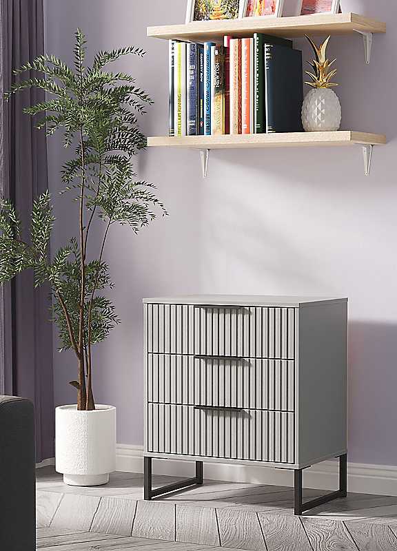 This 3 drawer bedside cabinet is wider than normal for added practicality. Perfect for any bedside or as a free standing storage unit. A new stand out range, with its new deep cut 'fluted' grove patten of the drawer and door fronts. Featuring black metal handles and black sleigh legs. A striking and individual range that is perfect for the modern home. All our furniture is made to order in the United Kingdom, to the highest quality using responsibly sourced materials. Furniture comes fully assembled (although items with legs will have those legs removed during transit to avoid damage). Ready AssembledWeight Capacity: 30kg Specifications Material: MFC & MDF Manufacturer's 1 year guarantee Product Care: Wipe clean onlyMade in the UK Weight of product 28kg Wall Anchor kit included Overall Assembled Dimensions Hx76 Wx58 D40cm Specification Leg Material: Metal