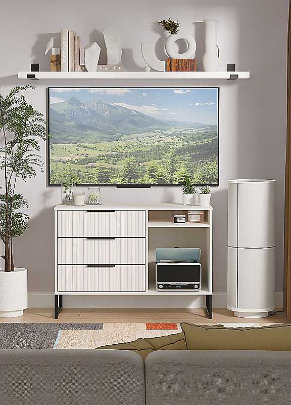 This modern storage unit features 3 drawers and a large storage area with a single shelf. Can be used as a TV/Media unit or sideboard. A new stand out range, with its new deep cut 'fluted' grove patten of the drawer and door fronts. Featuring black metal handles and black sleigh legs. A striking and individual range that is perfect for the modern home. All our furniture is made to order in the United Kingdom, to the highest quality using responsibly sourced materials. Furniture comes fully assembled (although items with legs will have those legs removed during transit to avoid damage).Ready AssembledWeight Capacity: 30kgSpecifications Material: MFC & MDFManufacturer's 1 year guaranteeProduct Care: Wipe clean onlyMade in the UKWeight of product 40kgWall Anchor kit includedOverall Assembled Dimensions Hx75 Wx97 Dx40Specification Leg Material: Metal