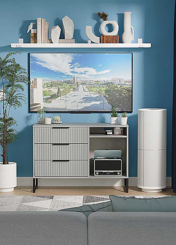 This modern storage unit features 3 drawers and a large storage area with a single shelf. Can be used as a TV/Media unit or sideboard. A new stand out range, with its new deep cut 'fluted' grove patten of the drawer and door fronts. Featuring black metal handles and black sleigh legs. A striking and individual range that is perfect for the modern home. All our furniture is made to order in the United Kingdom, to the highest quality using responsibly sourced materials. Furniture comes fully assembled (although items with legs will have those legs removed during transit to avoid damage).Ready AssembledWeight Capacity: 30kgSpecifications Material: MFC & MDFManufacturer's 1 year guaranteeProduct Care: Wipe clean onlyMade in the UKWeight of product 40kgWall Anchor kit includedOverall Assembled Dimensions Hx75 Wx97 Dx40Specification Leg Material: Metal