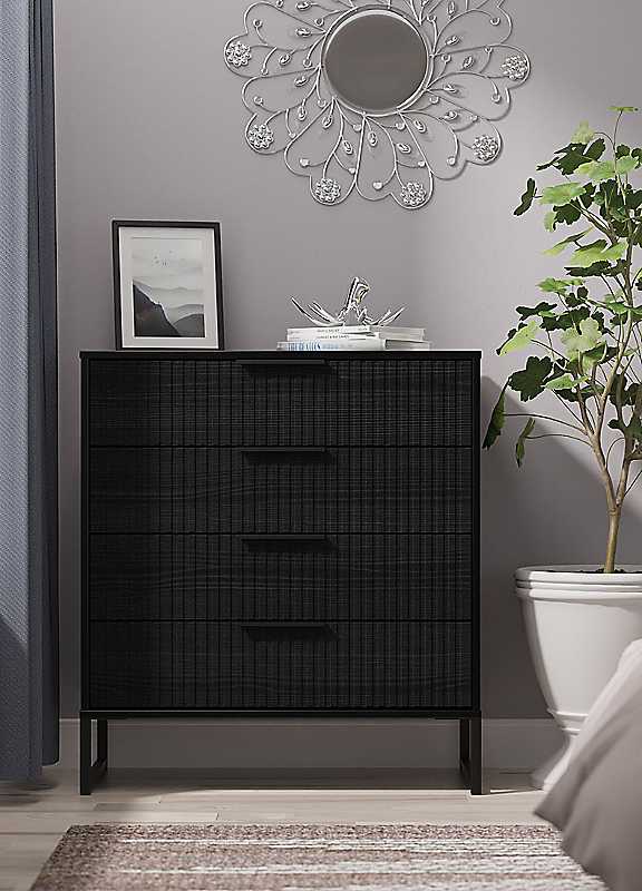 This wide 4 drawer chest of drawers is practical and stylish. Perfect for any home as a free standing storage unit. A new stand out range with its new deep cut 'fluted' grove patten of the drawer and door fronts. Featuring black metal handles and black sleigh legs. A striking and individual range that is perfect for the modern home. All our furniture is made to order in the United Kingdom to the highest quality using responsibly sourced materials. Furniture comes fully assembled (although items with legs will have those legs removed during transit to avoid damage).Ready Assembled Weight Capacity: 30kgSpecifications Material: MFC & MDFManufacturer's 1 year guaranteeProduct Care: Wipe clean onlyMade in the UKWeight of product 35.5kgWall Anchor kit includedOverall Assembled Dimensions Hx93cm Wx77 Dx40cmSpecification Leg Material: Metal