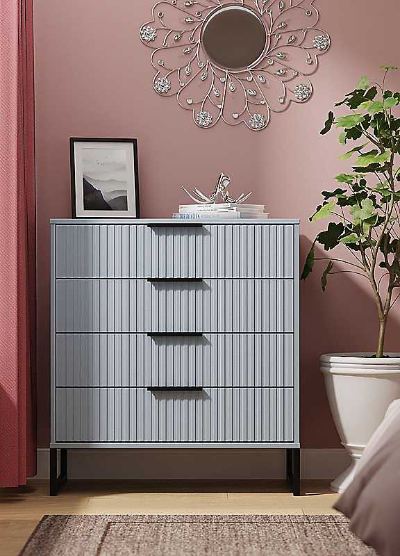 This wide 4 drawer chest of drawers is practical and stylish. Perfect for any home as a free standing storage unit. A new stand out range with its new deep cut 'fluted' grove patten of the drawer and door fronts. Featuring black metal handles and black sleigh legs. A striking and individual range that is perfect for the modern home. All our furniture is made to order in the United Kingdom to the highest quality using responsibly sourced materials. Furniture comes fully assembled (although items with legs will have those legs removed during transit to avoid damage).Ready Assembled Weight Capacity: 30kgSpecifications Material: MFC & MDFManufacturer's 1 year guaranteeProduct Care: Wipe clean onlyMade in the UKWeight of product 35.5kgWall Anchor kit includedOverall Assembled Dimensions Hx93cm Wx77 Dx40cmSpecification Leg Material: Metal