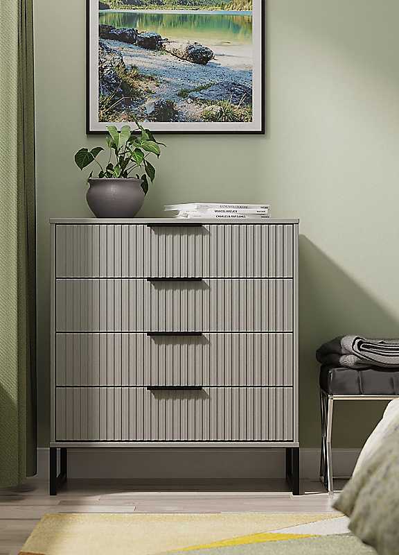 This wide 4 drawer chest of drawers is practical and stylish. Perfect for any home as a free standing storage unit. A new stand out range with its new deep cut 'fluted' grove patten of the drawer and door fronts. Featuring black metal handles and black sleigh legs. A striking and individual range that is perfect for the modern home. All our furniture is made to order in the United Kingdom to the highest quality using responsibly sourced materials. Furniture comes fully assembled (although items with legs will have those legs removed during transit to avoid damage).Ready Assembled Weight Capacity: 30kgSpecifications Material: MFC & MDFManufacturer's 1 year guaranteeProduct Care: Wipe clean onlyMade in the UKWeight of product 35.5kgWall Anchor kit includedOverall Assembled Dimensions Hx93cm Wx77 Dx40cmSpecification Leg Material: Metal