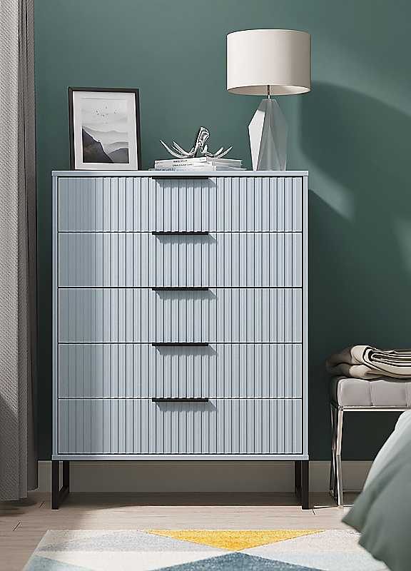This wide 5 drawer chest of drawers is practical and stylish. Perfect for any home as a free standing storage unit. A new stand out range with its new deep cut 'fluted' grove patten of the drawer and door fronts. Featuring black metal handles and black sleigh legs. A striking and individual range that is perfect for the modern home. All our furniture is made to order in the United Kingdom to the highest quality using responsibly sourced materials. Furniture comes fully assembled (although items with legs will have those legs removed during transit to avoid damage).Ready Assembled Weight Capacity: 30kgSpecifications Material: MFC & MDFManufacturer's 1 year guaranteeProduct Care: Wipe clean onlyMade in the UKWeight of product 41.5kgWall Anchor kit includedOverall Assembled Dimensions Hx109 Wx77 Dx40cmSpecification Leg Material: Metal