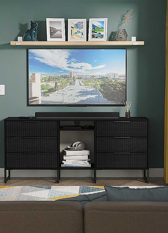 This wide storage unit features 6 storage drawers with a central shelf. Suitable for use as a TV/Media unit or sideboard. A new stand out range with its new deep cut 'fluted' grove patten of the drawer and door fronts. Featuring black metal handles and black sleigh legs. A striking and individual range that is perfect for the modern home. All our furniture is made to order in the United Kingdom, to the highest quality using responsibly sourced materials. Furniture comes fully assembled (although items with legs will have those legs removed during transit to avoid damage).Ready Assembled Weight Capacity: 30kgSpecifications Material: MFC & MDFManufacturer's 1 year guaranteeProduct Care: Wipe clean onlyMade in the UKWeight of product 59kgWall Anchor kit includedOverall Assembled Dimensions Hx75 Wx152 Dx40cmSpecification Leg Material: Metal