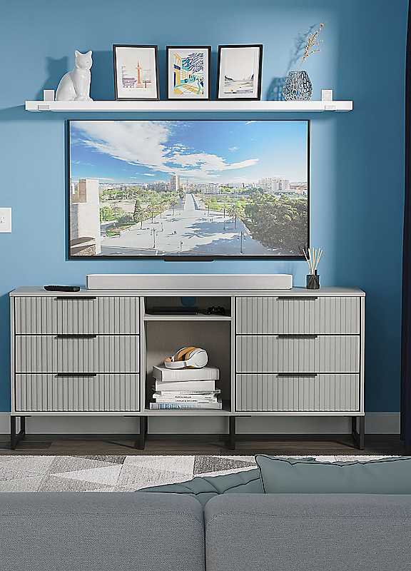 This wide storage unit features 6 storage drawers with a central shelf. Suitable for use as a TV/Media unit or sideboard. A new stand out range with its new deep cut 'fluted' grove patten of the drawer and door fronts. Featuring black metal handles and black sleigh legs. A striking and individual range that is perfect for the modern home. All our furniture is made to order in the United Kingdom, to the highest quality using responsibly sourced materials. Furniture comes fully assembled (although items with legs will have those legs removed during transit to avoid damage).Ready Assembled Weight Capacity: 30kgSpecifications Material: MFC & MDFManufacturer's 1 year guaranteeProduct Care: Wipe clean onlyMade in the UKWeight of product 59kgWall Anchor kit includedOverall Assembled Dimensions Hx75 Wx152 Dx40cmSpecification Leg Material: Metal