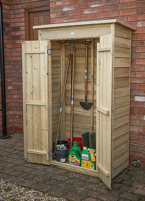The Tall Garden Store from Forest is perfect for positioning against a wall or fence. With a roof height of just under six foot, it is ideal for storing a wide range of outdoor equipment such as long handled gardening tools, children's toys or folding furniture. The relatively small footprint and natural colour finish means it will blend attractively into any garden setting. This Tall Garden Store is manufactured from traditional Pressure Treated overlap panels and finished with smooth-planed barge boards and Shiplap Tongue & Groove panels on the front. The felted Pent roof keeps the store weathertight and can be assembled sloping backwards or forwards to suit personal preference and position. The unit is also mounted on Pressure Treated bearers to keep it off the ground and dry. The double doors can be closed using the plate hasp and staple latch which can be secured with the addition of a padlock.Perfect for the storage of long handled gardening tools, folding furniture and outdoor equipment Approximate 750 litre capacityDouble doors have hidden hinges for additional securityDoors can be closed with the plate hasp and staple latch and secured with a padlock (not included)The clever design means the roof can be positioned sloping forward or backwardMade from Pressure Treated timber with a 15 year guarantee against rotManufactured in the UK from FSC® certified timberFelt, fixings and instructions are all providedFlat packed for self-assembly | tall garden shed, garden storage shed, outdoor tool storage, garden tool shed, outdoor garden storage, outdoor storage shed, garden storage cabinet, tall storage shed, garden tool storage, tall storage cabinet, wooden garden storage