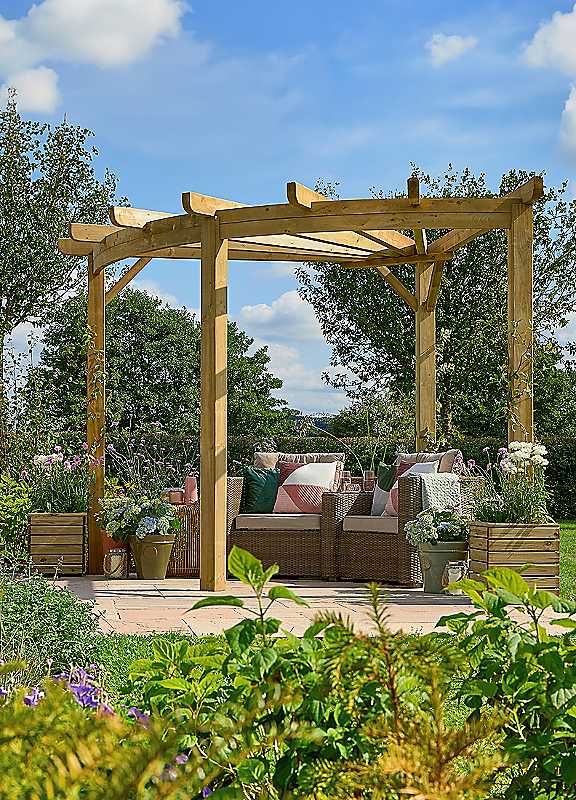 The new Premium Radial Pergola from Forest is a impressive structure with modern design and strong lines, it will complete any garden. Train climbing plants along the horizontal rafters and create a unique spot of shade for you to relax and enjoy your garden in or enjoy al fresco dining. The Premium Radial Pergola is perfect for positioning in a corner. New for 2024, the pergola is manufactured from sturdy pressure treated timber to give it a 15 year guarantee against rot and fungal decay. The 90 degree design also means you can purchase additional Premium Radial Pergolas to create a semi circle, a three-quarter circle or even a full 360 degree circle for a dramatic look. To ensure stability and avoid being compromised by strong winds, the structure can be sunk into the ground. Delivered flat packed with instructions for easy self-assembly.New, modern design with strong lines Roof rafters are ideal for training climbing plantsIdeal for creating corner garden haven15 year Anti-Rot Guarantee Manufactured from smooth-planed, Pressure Treated timber for a superior build Manufactured from PEFC® certified timber