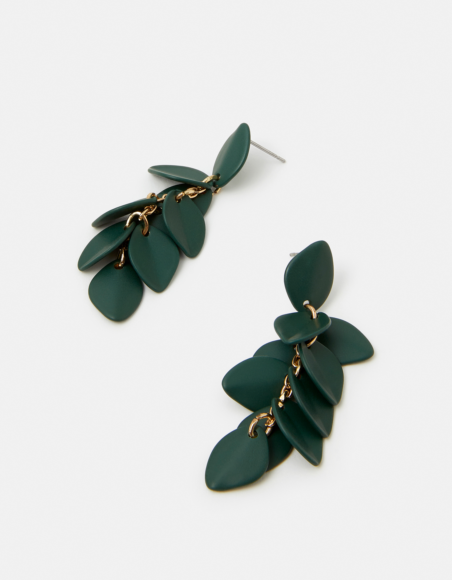 Designed in forest green, these drop earrings feature endless willow leaves that dance and swish with every step.Non-refundable.