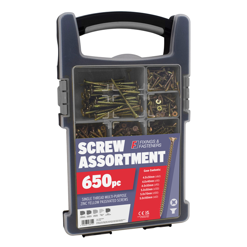 This comprehensive kit features a premium selection of single-thread screws, all treated with a yellow zinc passivated finish for enhanced corrosion resistance and durability. Master your fastening tasks with the ForgeFix Organiser Pro, a comprehensive kit containing a premium selection of 650 single-thread screws. These highly versatile screws are perfect for a wide range of fixing needs, including ironmongery, joinery, electrical and plumbing applications. The single-thread design provides increased holding power, particularly in particle boards like MDF, while the special wax coating ensures quicker and easier insertion. Each screw is treated with a yellow zinc passivated finish, offering enhanced durability and superior corrosion resistance compared to standard zinc-plated products. * 650-piece kit - comprehensive selection for various tasks * Single thread design - increased holding power in particle boards * Yellow zinc passivated - enhanced corrosion resistance * Wax coating - increases speed and ease of insertion * Deep insert bit recess - for a firmer positive drive * Versatile use - suitable for softwoods, hardwoods and chipboards * Countersunk head - compatible with pozidrive bits | Forgefix Organiser Pro MPS Zinc Yellow Wood Screw Kit 650 Piece in Gold