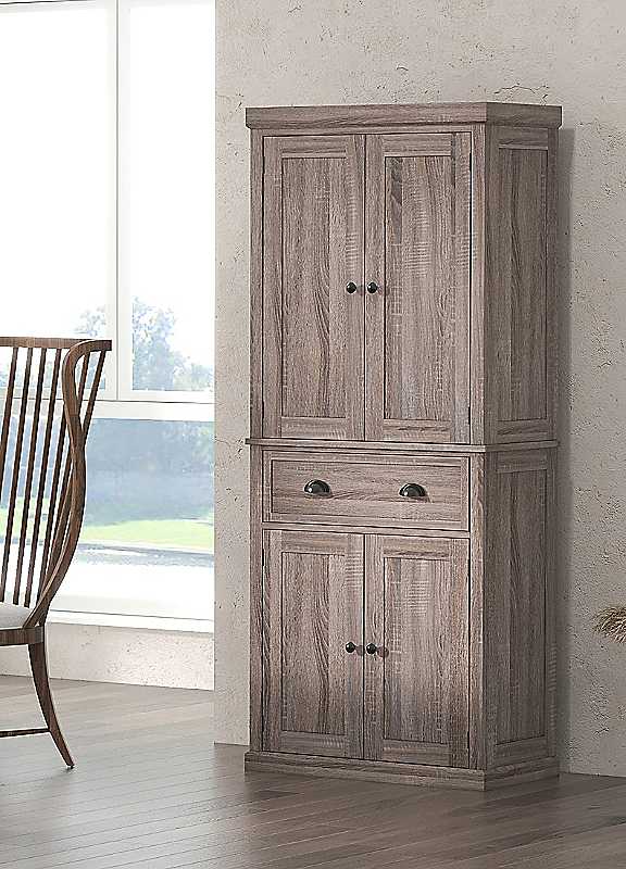 This kitchen storage unit is a perfect blend of functionality and aesthetic charm, ideal for organizing kitchenware or other home essentials. It features a top and bottom cabinet, with a middle slide-out drawer, providing plenty of storage space to keep everything tidy. Whether you need space for pots, pans, dishes, or pantry items, this unit has you covered. The movable shelves offer 3 adjustable levels, allowing you to store items of various sizes and heights. The sturdy build ensures durability, while the anti-tipping design on the backboard helps prevent accidents, making it safe for homes with children or pets. The cabinets beautiful form factor includes recessed door panels and antique brushed nickel hardware, adding a touch of elegance that blends seamlessly into your kitchen, dining room or utility room. Its a versatile piece that works in almost any space, enhancing your homes aesthetic while providing much-needed storage.Overall maximum Weight capacity: 100 kgPer shelf maximum load capacity: 10 kgPer drawer maximum Weight capacity: 8 kgMaximum Load: 100 kgAssembly requiredSafety Features: Anti-tipping design, can be attached to the wallFeatures: Magnetic closing doors, smooth handles for easy opening and closingMDF, Particle Board, Metal FixturesOverall dimensions approx. 184H x 76W x 40.5D cmTop cabinet dimensions approx. 82.5H x 32.5W cmBottom cabinet approx. 61H x 32.5W cmInner drawer dimensions approx. 10Hx 31.5W x 33.5D cmGround clearance approx. 7 cmPlease remember to measure your available space before ordering. If using on an un-carpeted floor we recommend rubber or felt protection pads be used under the legs to avoid damage to your floors.