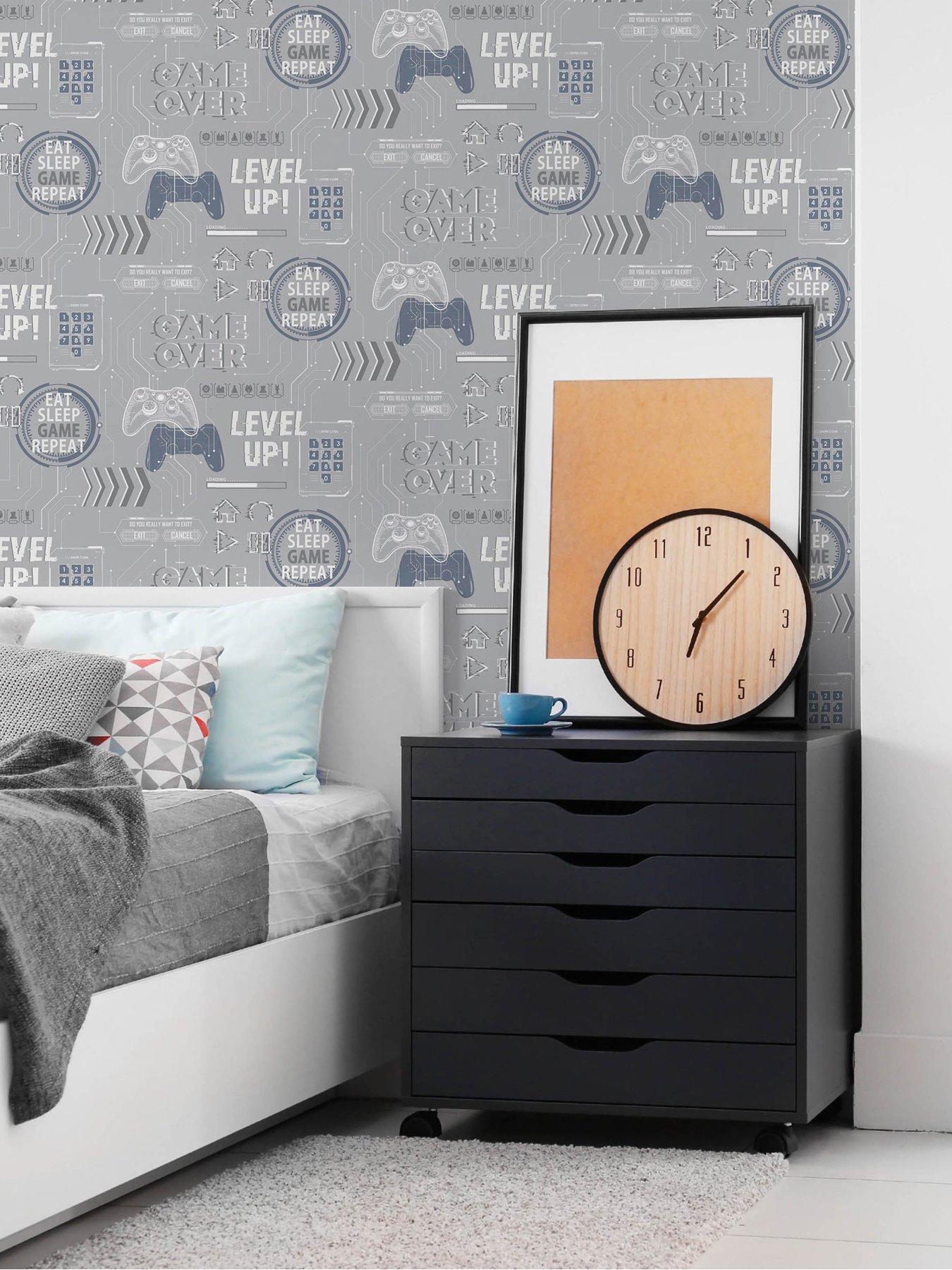 Fresco Game Over Wallpaper in Grey Whether refreshing your child's space or creating an awesome space that's perfect for gaming families, the Game Over wallpaper from Fresco will level up rooms in an instant. Against a versatile grey backdrop, the awesome design features monochrome motifs full of gaming artwork, including console controllers and code locks, as well as typography reading Level Up and Eat Sleep Game Repeat . Bold, defined lines running all over complete the look and create a motherboard-inspired appearance that gamers will love. Use this wallpaper in a key spot (think behind a TV setup) or create a consistent look by hanging it all around the room. Depth: 6 CM Height: 6 CM Material Content: Paper Wallpaper Design: Patterned Width: 52 CM Suitable for living and bedroom areas On-trend, conversational design Paste the Paper Application Spongeable Designed and manufactured in the UK