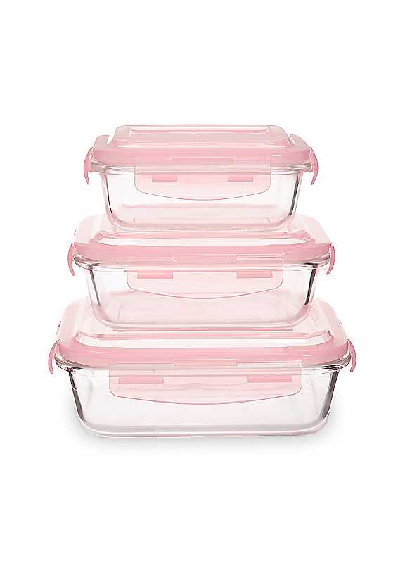 This set of three rectangular containers are made from borosilicate glass that is non porous and maintains hygiene. Each canister includes a pink PP lid with clip locks and an airtight silicone seal, making it ideal for food storage.Wash in warm soapy water20% Polypropylene80% Borosilicate Glass