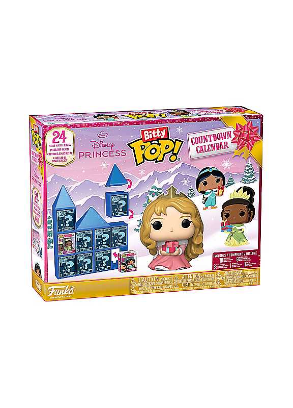 Count down to your favourite festive holiday - or any special occasion - with the Disney Princess 24 Day Bitty POP! Countdown Calendar! Open the tiny doors to reveal 10 Bitty POP! Collectibles, 9 stackable display pieces, 3 holiday accessories, 1 keychain case, and 1 pin case. Expand your princess lineup by making this Disney Princess 24 Day Bitty POP! Countdown Calendar the next addition to your collection. Bitty POP! Collectibles are packaged in hard acrylic cases with detachable bottom lids. Detachable bottom lids double as acrylic bases, to which the Bitty POP! figures are adhered. Vinyl figures are approximately 0.9 in (2.3 cm) tall. Acrylic keychain cases and acrylic pin cases are approximately 1.3 in W x 1.6 in H x 1.2 in D (3.3 cm W x 4.1 cm H x 3 cm D) and fit all standard Bitty POP! cases. Bitty POP! Keychain is approximately 3 in (7.6 cm) long.Acrylic keychain case dimensions approx. 1.3W x 1.6H x 1.2D in, Acrylic pin case dimensions approx. 3.3W x 4.1H x 3D cm, Keychain length approx. 7.6 cm (3 in)Warning: Choking Hazard. Collectibles are small. Not for children under the age of 3 years old.Warning: Pin contains functional sharp points.