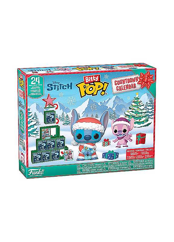 Count down to your favourite festive holiday - or any special occasion - with the Disney's Stitch 24 Day Bitty POP! Countdown Calendar! Open the tiny doors to reveal 10 Bitty POP! Collectibles, 7 stackable display pieces, 3 holiday accessories, 2 keychain case, and 2 pin case. Expand your cute and fluffy lineup by making this Disney's Stitch 24 Day Bitty POP! Countdown Calendar the next addition to your collection. Bitty POP! collectibles are packaged in hard acrylic cases with detachable bottom lids. Detachable bottom lids double as acrylic bases, to which the Bitty POP! Figures are adhered. Vinyl figures are approximately 0.9 in (2.3 cm) tall. Acrylic keychain cases and acrylic pin cases are approximately 1.3 in W x 1.6 in H x 1.2 in D (3.3 cm W x 4.1 cm H x 3 cm D) and fit all standard Bitty POP! cases. Bitty POP! Keychain is approximately 3 in (7.6 cm) long.Acrylic keychain case dimensions approx. 1.3W x 1.6H x 1.2D in, Acrylic pin case dimensions approx. 3.3W x 4.1H x 3D cm, Keychain length approx. 7.6 cm (3 in)Warning: Choking Hazard. Collectibles are small. Not for children under the age of 3 years old.Warning: Pin contains functional sharp points.