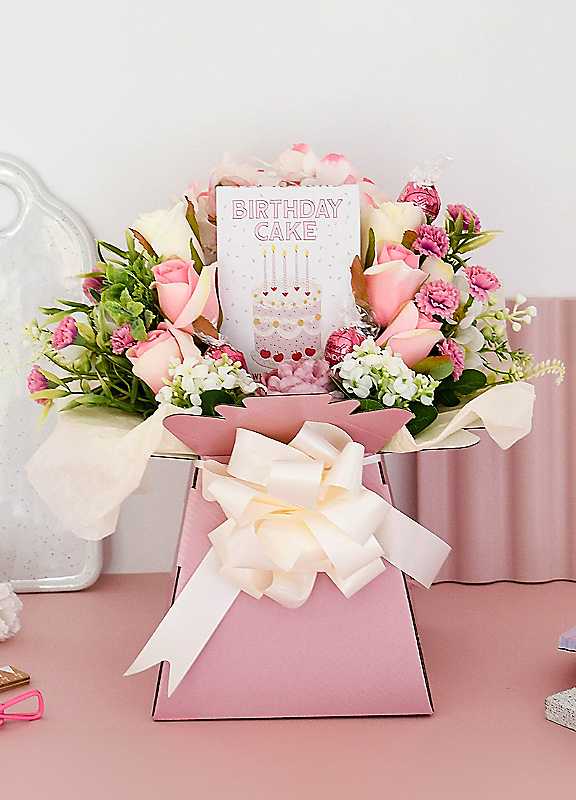 Designed in soft shades of pink and cream, this luxurious arrangement blends indulgent treats with timeless floral elegance - perfect for birthdays, celebrations, or simply making someone feel extra special.Presented in a stylish pink bouquet box and tied with a premium satin bow, each arrangement is hand crafted to order by our expert team, ensuring every bouquet is a one-of-a-kind gift that looks stunning from every angle.Contains silk flowers.Contents:1 x Birthday Cake Chocolate Bar4 x Strawberry & Cream Lindor2 x Cream Lacey2 x White Delilah4 x Pixie1 x Ranunculus4 x Pink Roses2 x White Roses1 x Pink HydrangeaWhether you're sending birthday wishes or adding a decorative centrepiece to a celebration, this chocolate and flower bouquet is guaranteed to impress.1 x Birthday Cake Chocolate Bar4 x Strawberry & Cream Lindor2 x Cream Lacey2 x White Delilah4 x Pixie1 x Ranunculus4 x Pink Roses2 x White Roses1 x Pink HydrangeaLindt Strawberry & Cream Truffles - Ingredients: Sugar, Cocoa Butter, Vegetable Fat (Coconut, Palm Kernel), Whole Milk Powder, Lactose, Cream Powder (1.1%), Emulsifier: Lecithin (Soya), Strawberry Powder (0.2%), Natural Flavouring, Colouring (Beetroot Red), Flavourings